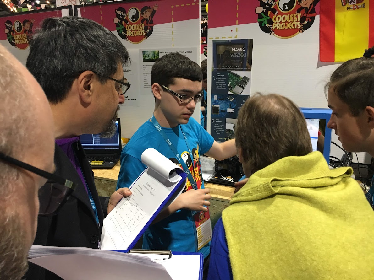 El sábado 26/5/2018 lo viví como si fueran a entregarnos un premio nobel. El día se desarrollo según lo previsto. Los chicos (Pablo y Ramón) montaron su proyecto, lo probaron y lo pusieron en marcha. Al poco tiempo paso el jurado, y todo muy bien. A los minutos hubo un poco de revuelvo donde exponíamos nosotros, y pregunte: ¿que pasa?, y mis compañeros me cuentan que ha venido el jurado del premio internacional a interesarse por este proyecto.